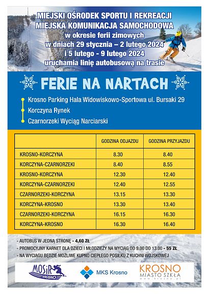 W okresie ferii zimowych, od poniedziałku do piątku, autobusy MKS Krosno będą kursować na trasie Krosno - Korczyna - Czarnorzeki - szczegóły na plakacie.