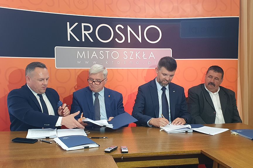 Umowę na zakup elektrycznych autobusów dla MKS Krosno podpisali: Piotr Przytocki – prezydent Krosna, Tomasz Soliński – wiceprezydent Krosna i Rafał Zajas – dyrektor sprzedaży regionu południowego Solaris Bus & Coach w obecności Romana Gierlacha – prezesa MKS Krosno.